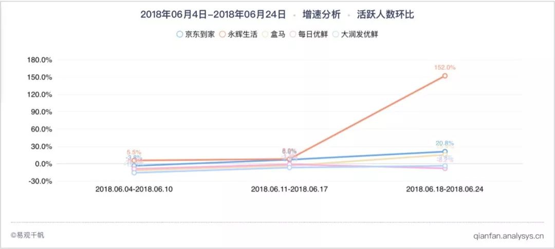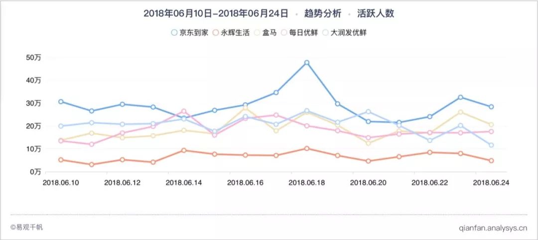世界杯期间,生鲜电商加大营销优惠力度,在延长夜间配送时间和加快配送速度,充分挖掘用户服务体验满意度,及时满足你的饕餮食欲。世界杯赛期至今,生鲜电商应用日活规模相较于赛前呈现较大增幅。其中,每日优鲜、盒马、大润发优鲜、永辉生活(生鲜品类:超级物种),在赛期整体日活规模上涨的同时也表现出波动性。京东到家配合主平台京东,围绕618暨端午节大促在6月18日当天形成明显的日活高峰,日活规模达到47.7万。