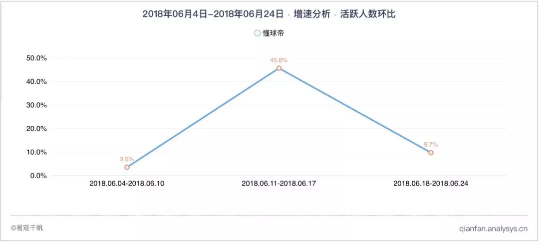 在周活跃规模增速方面, 世界杯赛事第一周,懂球帝增速一骑绝尘,环比增长45.6%,第二周增速开始减缓,但也达到了9.7%。