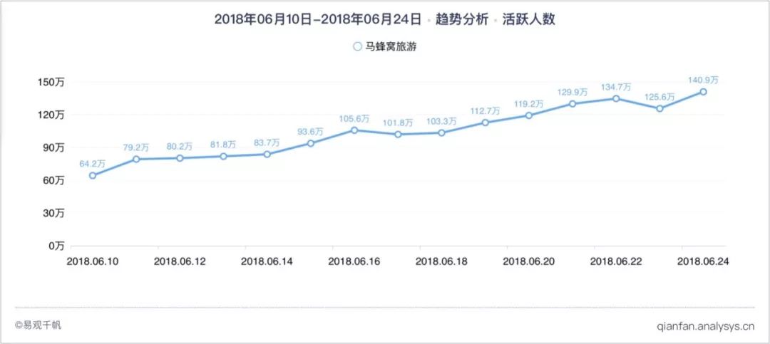 不过从企业层面来说,世界杯是企业推广的重要契机。要想在瞬间抢抓观众注意力,制造冲突和循环洗脑的品牌呼号也许是最明智和简便的选择,这也正是叶式广告被吐槽和指责的缘由。虽然广告风格上可以有百家争鸣,不过在资本社会,我们更看重的商业效果。马蜂窝在世界杯期间投放广告,加上活动运营,其APP在赛事期间日活规模呈现持续增长,日活规模从6月13日的81.8万增至6月24日的140.9万,从这点来说,马蜂窝的营销推广是相当成功的。