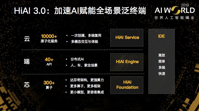 他讲到:“HUAWEI HiAI是面向智能终端的AI能力开放平台,基于芯、端、云三层开放架构,即芯片能力开放(HiAI Foundation)、应用能力开放(HiAI Engine)、服务能力开放(HiAI Service),构筑全面开放的智慧生态,让开发者能够快速地利用华为强大的AI处理能力,为用户提供更好的智慧应用体验”。同时,王成录也宣布了开放HUAWEI HiAI 3.0平台。