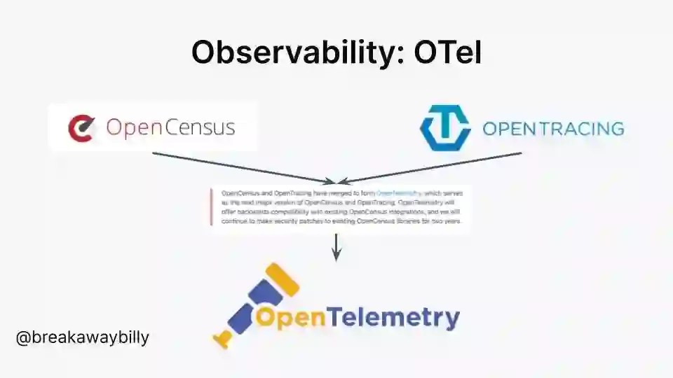 可观察性(有助于彻底地理解“分布式”系统)是一个热门领域,因为它可以帮助定位并解决生产环境 Bug,使你不会再被凌晨 3 点的警报惊醒。几年前对于可观察性如何实现,人们有许多不同的想法,其中包括 OpenCensus 和 OpenTracing。将这两个项目的创意和功能合二为一就形成了 OpenTelemetry,这是现在云原生领域发展最快的项目之一。这两个项目没有在标准化方面展开竞争,而是融合到了一个项目里,这为技术的发展提供了强大的推动力。这两个项目的结合,使 OpenTelemetry 社区能够汲取 OpenCensus 和 OpenTracing 项目的优秀创意,使贡献者们能够团结在一起推动项目更快地向前发展,最终为生态系统带来更好的项目。
