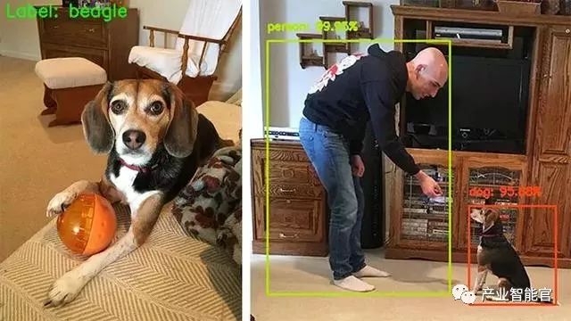 图 1(右)展示了一个深度学习目标检测的例子。请注意,人物和狗都被用边界框找出了位置,同时类标签也被预测到了。