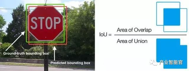 图 5: 在这个交并比的可视化例子中,标注边界框(绿色)可以与预测的边界框(红色)进行对比。IoU 与 mAP 一起被用来评价一个深度学习目标检测器的精度。计算 IoU 的简单方程如图 5(右)所示。