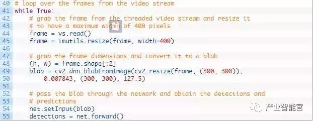 第 48 行和 49 行从这一帧中生成 blob。要了解更多 blob,以及如何使用 cv2.dnn.blobFromImage 函数构建 blob,请在以前的博文中查看所有细节(https://www.pyimagesearch.com/2017/11/06/deep-learning-opencvs-blobfromimage-works/)。