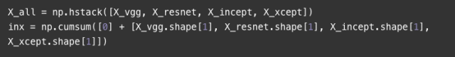 每个预训练的模型(如上述的ResNet)都可以生成特征集(X_vgg, X_resnet, X_incept, X_xcept),我们以此作为开始(完整的代码请参阅git repo)。方便起见,将所有的特征集合叠加到一个单独的矩阵中,但是保留边界索引,以便每个模型都可以指向正确的集合。