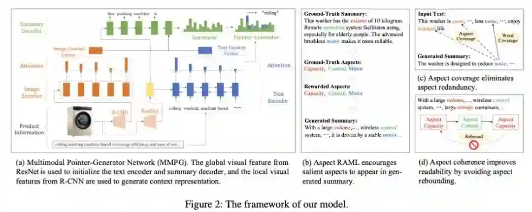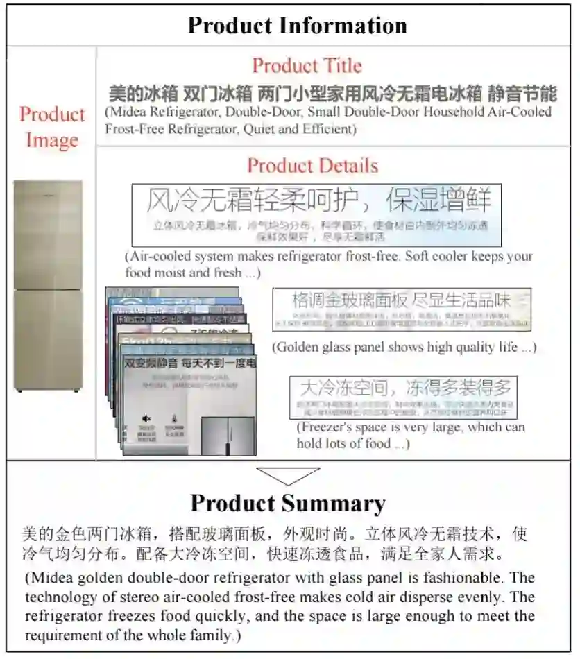 商品摘要任务的挑战性在于:一方面,商品给顾客的第一印象来自该商品的外观,这对顾客的购买决策有着至关重要的影响。因此,商品摘要系统必须能够充分挖掘商品视觉信息,反映商品的外观特色。另一方面,不同的产品有不同的卖点。例如,紧凑型冰箱的优点是节省空间,而环保型冰箱的优点是节能。因此,商品摘要应该反映商品最独特的方面,从而最大限度地促成消费者的购买。