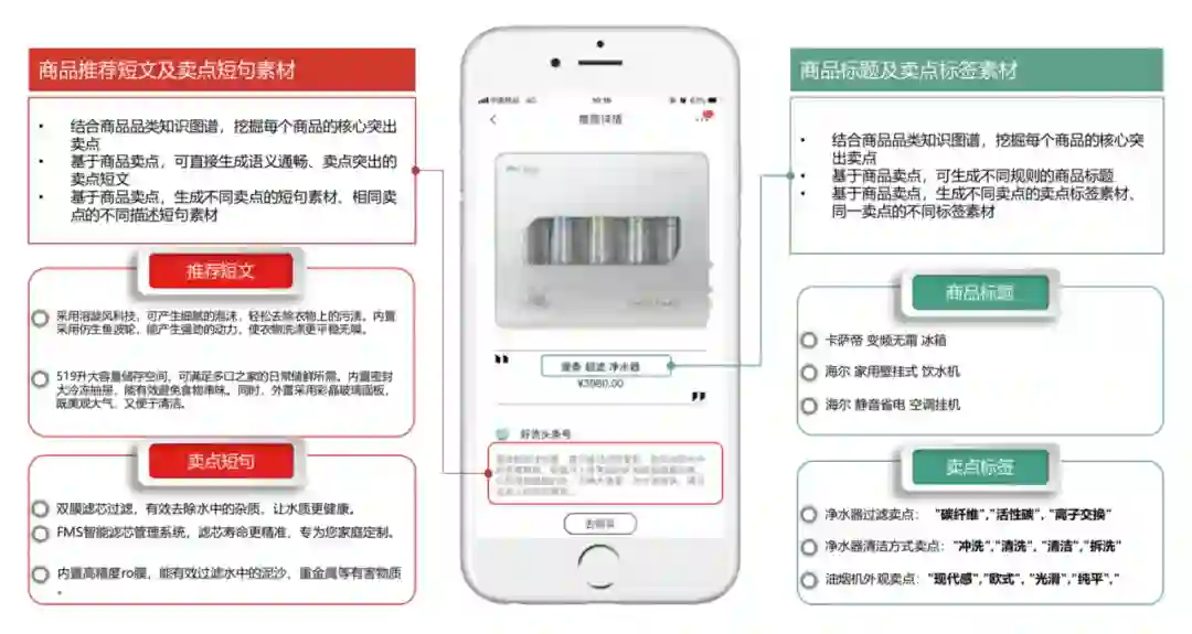 通过输入多模态(图片 + 文本)、异构(结构化商品知识图片和非结构化纯文本)数据,挖掘卖点和商品要素,模型包括多模态的编码器和解码器、预训练语言模型提高文本合规性、句间流畅度模型提高文本逻辑性、标点纠错模型改正标点错误,最终输出商品的营销短文。