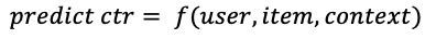 我们迅速在资讯信息流推荐场景上实践ltr算法。Ltr一般分为point wise、pairwise、list wise,一般工程上使用pointwise较多,简单,成本低,收益也可靠。简单来说,Ltr即预测user对一个未消费item的预估点击率,即: