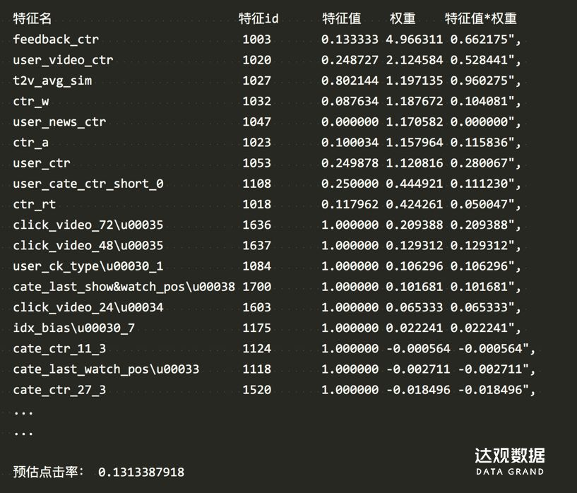 lr模型可以方便debug每个样本的各个特征和权重,权重高的特征显然更加重要。如果你觉得重要的特征权重过低了或者不重要的特征权重过高了,也许就要思考为什么了。以下是一个样本的debug信息。