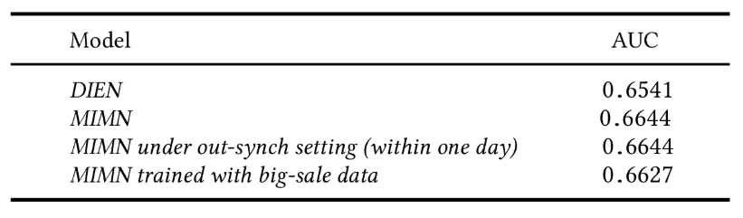 MIMN 算法是由两部分组成,一部分是用户兴趣提取,一部分是 CTR 预估,在线计算会涉及到 UIC 和 RTP 两组服务。因此会存在模型参数同步的问题,在表三中我们做了相关实验,证明 UIC 和 RTP server 模型参数相差一天,对于模型离线效果无影响。我们系统是采用增量训练的方式,每小时就会更新模型参数,会大幅降低参数不一致风险。