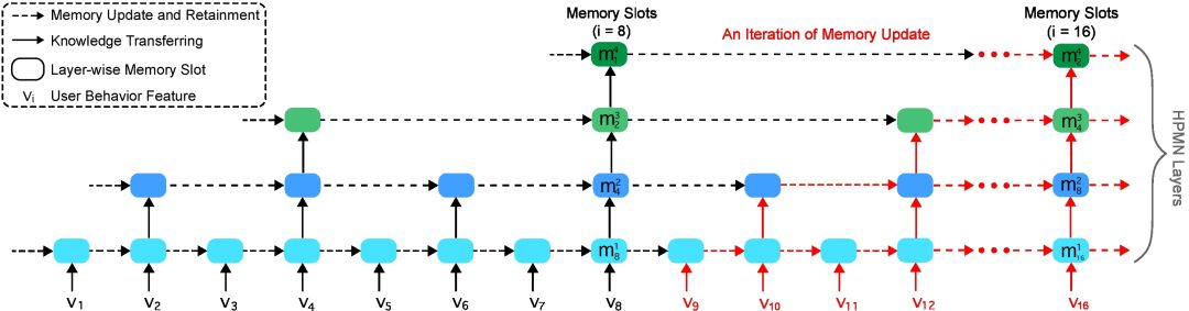 接下来简单介绍一下 HPMN。HPMN 是从时间维度进行 memory 构建。它的设计理念认为用户存在长、中、短各变化趋势的兴趣。它的设计思路借鉴层级 RNN,采用周期向上归纳的设计,分层刻画不同时间跨度的兴趣偏好,与此同时,为了防止不同层之间具有相似的表达,它也加入协方差约束 ( 兴趣多样化约束 )。结构如图14所示,比较的简单明了,采用幂次固定周期进行归纳总结的方式。