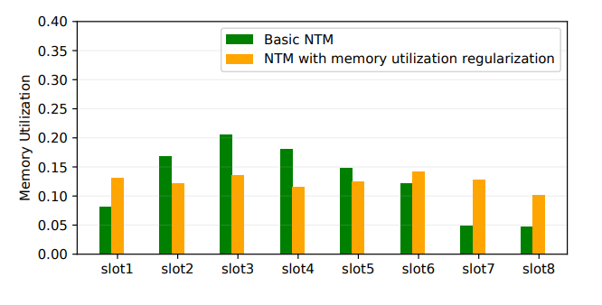 为了有效提高 memory 利用率,在 NTM 的基础上,我们加入了 Memory Utilization regularization 的考虑,希望约束不同 memory slot 中的写入方差。NTM 使用基于内容的寻址方式,会导致部分的 slot 写入利用率很低 ( 定义为:累计的写入权重 ),如图10所示,绿色的柱条是亚马逊数据集使用原始的 NTM 得到的各 slot 的利用率,可以看出最后两个 slot 利用率都很低,线上使用36个 slot 的时候部分 slot 利用率很低的现象更为严重。