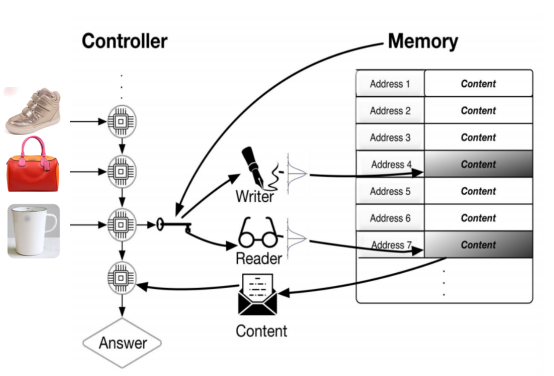 关于 NTM 模型细节方面,它包括几个关键部分:Controller,读写头 ( 一般集成在 Controller 里 ) 以及 Memory。