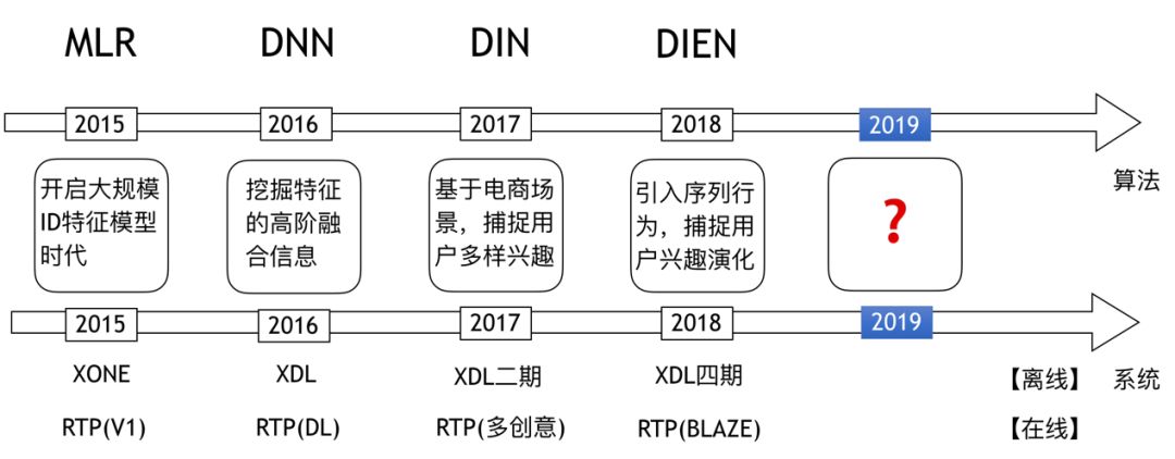 阿里妈妈定向技术团队技术迭代的路线如图2所示。在2015年的时候从 LR 升级到了分片线性模型 MLR,开启了大规模 ID 特征模型时代;2016年引入 DNN 模型,利用深度学习挖掘特征的高阶融合信息;2017年提出了 DIN 模型,通过引入序列信息,基于电商场景,捕捉用户的多峰兴趣;2018年创造出了 DIEN 模型,通过 GRU 时序结构,引入序列行为,捕捉用户兴趣的演化。每一次技术创新的背后都是在挖掘数据的价值。与此同时,每次技术创新的背后都有系统服务升级的支持,训练引擎从 XONE 升级到 XDL 一期、二期、四期,在线服务引擎也从 RTP 的1.0版本逐步升级到高性能 RTP 的 BLAZE 版本。可以总结出整体的技术发展思路是:数据价值的挖掘推动算法模型的创新,而算法模型的创新又推动了系统服务的升级。按照这样的思路,2019年进行的技术迭代就是用户长期兴趣的挖掘。