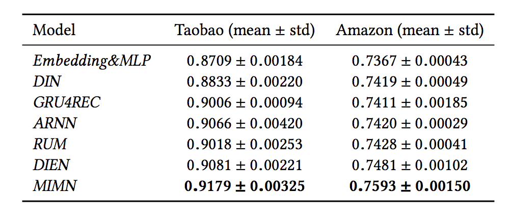 我们采用了亚马逊以及淘宝的公开数据集来进行实验,对比的模型有:Embedding & MLP、DIN、GRU4REC、ARNN、RUN、DIEN,从表1可以看到在这两个数据集上的效果 MIMN 模型都优于对照的模型。