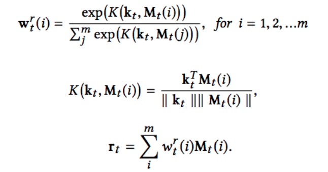当一个新的输入进来的时候 Controller 会产生一个 Key Vector,它可以与 Memory 进行交互得到读权重向量,交互过程与注意机制相似,但是有一点与注意力机制不同,即 attention 是在做点积操作,而 NTM 中是在计算余弦相似度,它是为了避免 memory 之间 scale 具有差距,产生马太效应。例如一个 memory 的 scale 很大,在点积操作下产生的 score 也很大,以致于它长期具有一个很大的 weight。当我们得到每个 memory 的 read weight 之后,我们对每个 memory 进行 weighted sum 可以得到响应向量。详细计算公式如下。