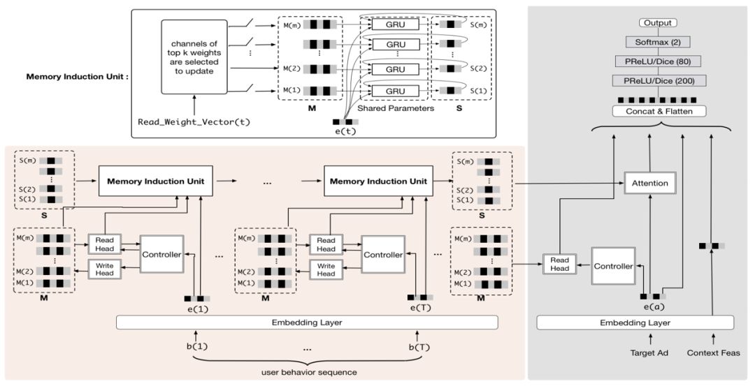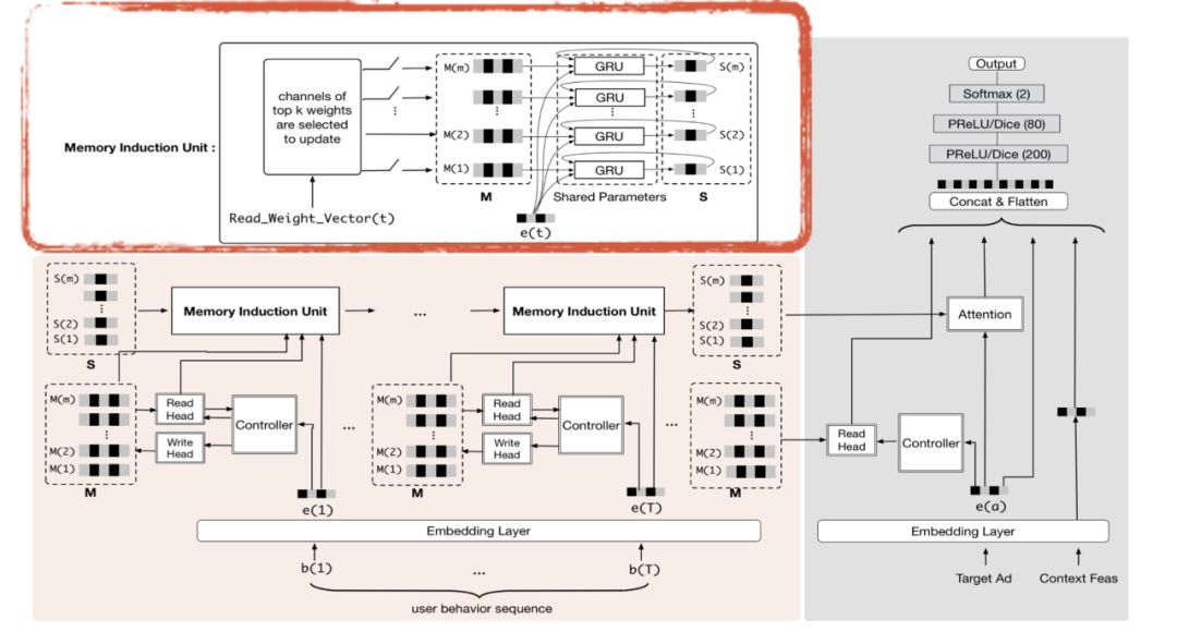 NTM 算法 memory 通常用来存储原始数据信息,遗失了对于更高阶的信息的捕捉。为了能更好捕捉用户兴趣,MIMN 设计了 Memory Induction Unit ( MIU ) 来捕捉用户兴趣演化。
