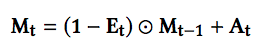 为了平衡各 slot 的使用率,我们对 write weight 进行了 re-weight 的操作,即累积之前的 write weight 得到 gt 向量,经过转换后得到转移概率矩阵 Pt 再乘以 write weight 向量得到改写后的写入权重。改写权重的计算方式如下:
