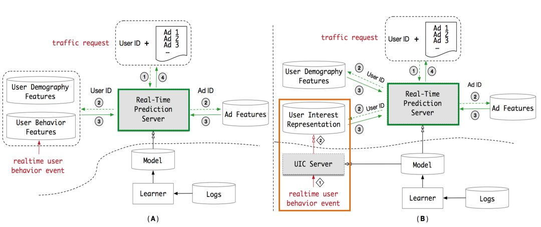 在原有的 RTP 系统 ( 左图 ) 的基础上我们引入了 UIC 模块 ( 右图 ),即用户兴趣中心,它能实现我们想要的三个能力:异步计算、兴趣向量的存储以及增量更新计算。在原有 RTP 系统流程的基础上,新系统把取用户行为特征改成取用户兴趣向量,直接对兴趣向量进行 attention 操作,辅助点击率预估,同时当有实时行为进来的时候,UIC 会直接增量更新用户兴趣向量。