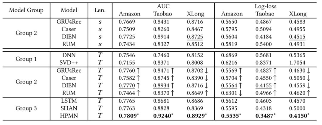 HPMN 模型的效果如表3所示,实验做了两个对比,上面的 s 指的是一个短序列,下面的 T 指的是长期行为序列,s 只做了 group 2 的实验对比,说明当我们把行为序列扩长,会带来明显的增益,另外 HPMN 在长期行为序列下对比其他模型也是有明显的效果提升。