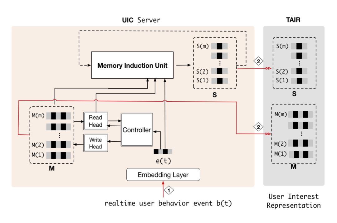 MIMN 的在线实现如图13所示,时序模块存放在 UIC 系统中,当有个新的用户行为时,会通过 Controller 实时更新用户的 memory 向量,并通过 memory induction unit 来更新 channel 演化向量,然后将这两组向量存放在 TAIR 以供线上实时请求系统应用。