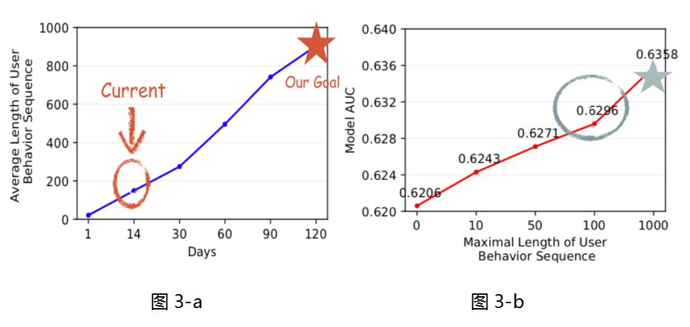 在谈长期兴趣挖掘的价值之前,得先看看目前团队建模能力的现状,首先 DIN 模型与 DIEN 模型都通过用户的历史行为挖掘用户兴趣,其中 DIN 模型对用户的原始行为序列进行 attention 操作,获取用户相关的兴趣,进行用户的点击率预估,而 DIEN 模型是通过 GRU 对用户原始行为序列进行时序的建模,但是由于一定的系统瓶颈,可以处理的最大历史行为长度为100。从图 3-a 可以看出历史行为长度100仅对应用户14天的行为,当用户行为窗口增加到120天时,用户历史行为长度爆炸到了1000。为了看出长期历史行为的价值,我们做了简单的实验来评估不同长度用户行为引入 CTR 预估模型后的离线表现,我们采用 DNN 模型,把行为序列特征 ( 包括用户点击的 item 以及 item 的属性特征等 ) 进行简单的 embedding sum 之后输入模型,如图 3-b 所示,利用1000长度用户行为信息相比100长度,能够带来 0.6% GAUC 的提升。这里采用的 GAUC 是以用户粒度为 group 计算的 AUC,然后根据用户的 frequency 进行 weight sum。其中0.6%离线提升对在线业务有重大意义,由此可见长期历史行为具有显著的利用价值。