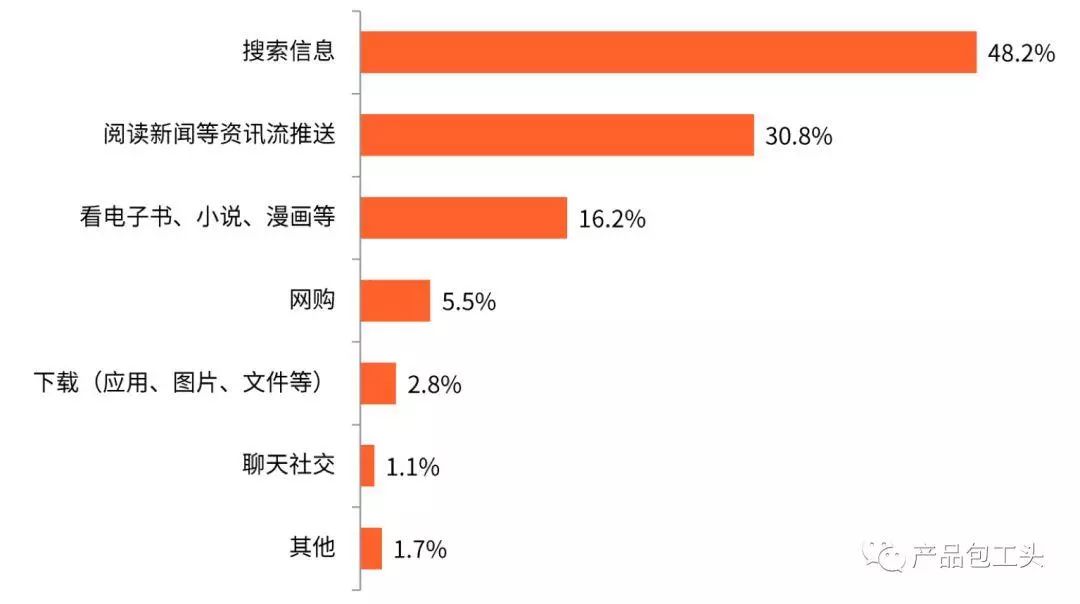 看过手机浏览器的发展,我们再来看看用户的行为。据数据分析:通过手机浏览器进行搜索信息的占比48.2%,信息搜索还是占据主导。