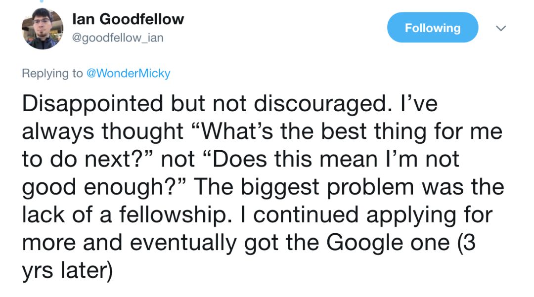 Goodfellow说他自己不会因为被拒绝而质疑自己是不是不够好,反而会一直想“接下来干什么才是最佳选择?”
