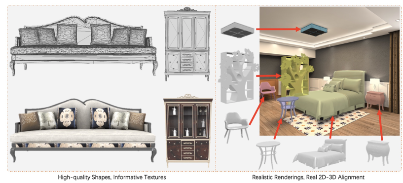 同时,在相关团队的技术研发过程中发现,海量的高质量 3D 模型与纹理,以及专业的房屋设计布局是推动未来数字化家居建设的基础。为了启发高质量 3D 模型理解与重建,并且建立学术研究与工业应用的桥梁。阿里巴巴针对家居场景开源大型3D数据集3D-FUTURE(3D Furniture shape with TextURE)。