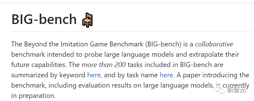 BIG-bench是一个众包的基准数据集,旨在探索大型语言模型并推断其未来的能力,其中包含200多个任务。