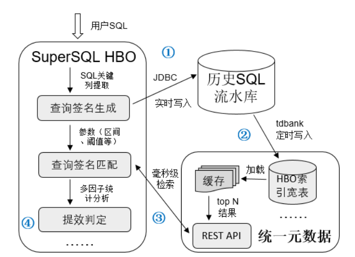 HBO 框架的设计实现包括四个子模块,如下图中标示;它们也代表了一条用户 SQL HBO 优化的四个串行阶段。基于引擎选择(SQL 优化)的实时性要求,整个 HBO 耗时必须控制在毫秒级。