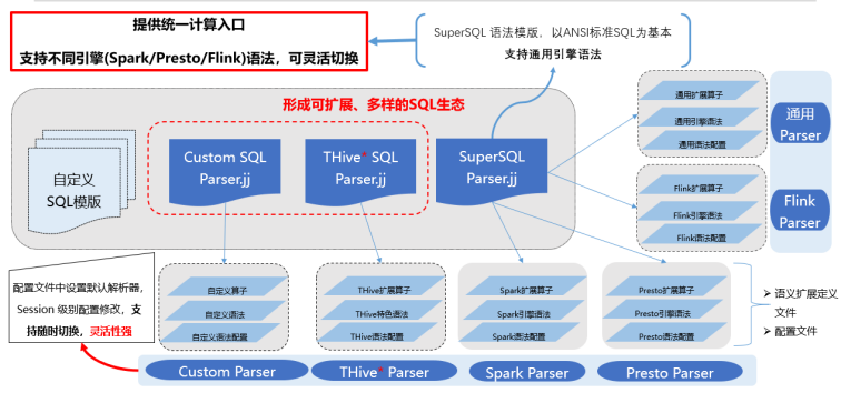 1.SQL 兼容:在进行 SQL 兼容时,为解决部分大数据平台语法与业务强耦合、定制化严重,以及不同语法强行融合易导致歧义的问题,SuperSQL 遵循干净、可扩展、可替换、多场景兼容的兼容准则,提供插件式的解析模块,将 SQL 语法模板化,分类管理,形成可扩展、多样的 SQL 生态。SuperSQL 将 SQL 语法分为两大类即通用型(如 SQL 标准语法,以及常见的 Spark、Hive、Flink 等大数据查询语法)、独特型(自定义语法,不具有普适性),基于分类语法模板、语义扩展定义、配置文件生成多样的 SQL 解析器,并且支持动态切换解析器,灵活性强。任意解析器得到的语法树均将转换为 SuperSQL 统一的逻辑计划,SuperSQL 可基于此逻辑计划生成符合不同引擎或数据源方言语法的执行语句(这一过程即 SQL 转换)。SuperSQL 默认使用通用 Parser,其基于 SQL 标准语法,支持大部分通用大数据语法(如 Spark、Hive 语法),适用于大部分的大数据系统组件。而对于一些与业务逻辑强耦合的自定义语法,支持自定义 SQL 模板,生成自定义解析器,通过这种做法,结合上文提及的生成 SuperSQL 统一执行计划以及下文提及的 SQL 转换,可以灵活地将业务任务切换到指定引擎。