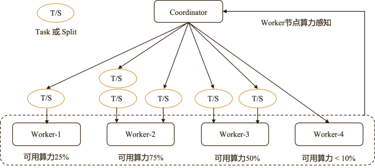 天穹 Presto Coordinator 在运行过程中,会实时感知 Worker 节点的算力变化情况,同时计算出对应的节点可用算力权重,在 Task 和 Split 的调度过程中,针对不同的算力权重,根据模型计算出相应的 Worker 上还可分配的 Task 或 Split 数目,对于算力严重下降的节点,少分配或不分配 Task 或 Split,尽量避免长尾问题,从而做到自适应的调度。