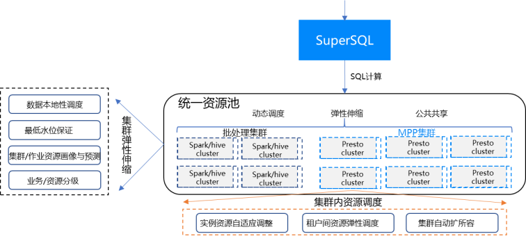 资源层整合云上和云下资源,把能够把所有资源统一管理起来,对计算提供统一的资源池。通过资源自适应调整、租户间资源弹性调度、集群中资源借调等手段,统筹管理调度资源,提升资源整体利用率。