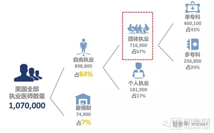 而在美国,自由执业是医生主要的执业形式,其中大部分为团体执业医生。
