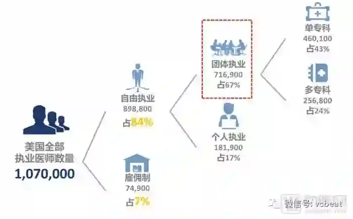 美国全部的100多万执业医生中,团体执业医生占自由执业医生的67%,而其中有43%都是以单一学科为主的团体执业医生集团,体现了美国医疗服务体系精细化分工的趋势。