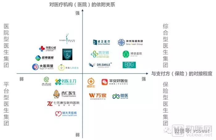 其中处于第一象限的综合型医生集团,是相对比较领先的医生集团,例如:张强医生集团、冬雷脑科、卓正医疗和博德嘉联等,这类医疗集团往往有着深厚的医疗资源,自有线下医疗机构,同时已经部分或者全部对接支付方保险公司。