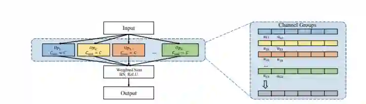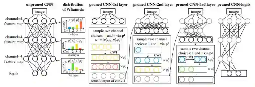 短评:NAS 用于剪枝,也是个不错的点。本文NAS 师法DARTS,基本思想相同,待剪枝的网络相当于超网,结构和参数一起优化,最后找出概率最大的那支。不同之处在于结构参数在DARTS 中是各个op 的参数,此处是channel size。