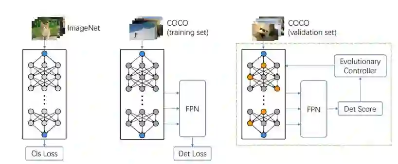短评:NAS 用于OD 是众望所归,本文是目标检测领域一篇NAS 力作,也是旷视先前工作SPOS 的延续。优点在于复用了给分类训练的超网,然后接入固定的检测后端FPN 在COCO上做精调训练。最后搜索过程用了主流方法之一演化算法,以COCO 为验证集来评估模型性能。虽然目前还是集中于主干网,但为以后主干和后端同时搜索奠定了基础。