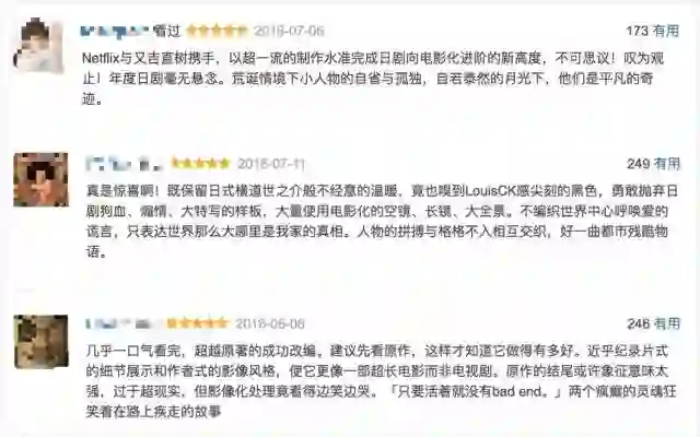 而说到漫画改编,就不得不提《深夜食堂》。原本一直属于电视剧的《深夜食堂》,第四季的出品和发行都是网络视频平台Netflix,实现了由台到网的“华丽转身”。不仅质量保持在豆瓣评分8.6分,还通过Netflix平台,以《MidnightDiner: Tokyo stories》之名向全世界190多个国家和地区传播。