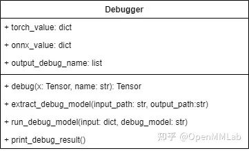 debug_apply。该方法需要在原 PyTorch 模型中调用,可以为导出的 ONNX 模型添加 Debug 算子节点,同时记录 PyTorch 调试张量值。