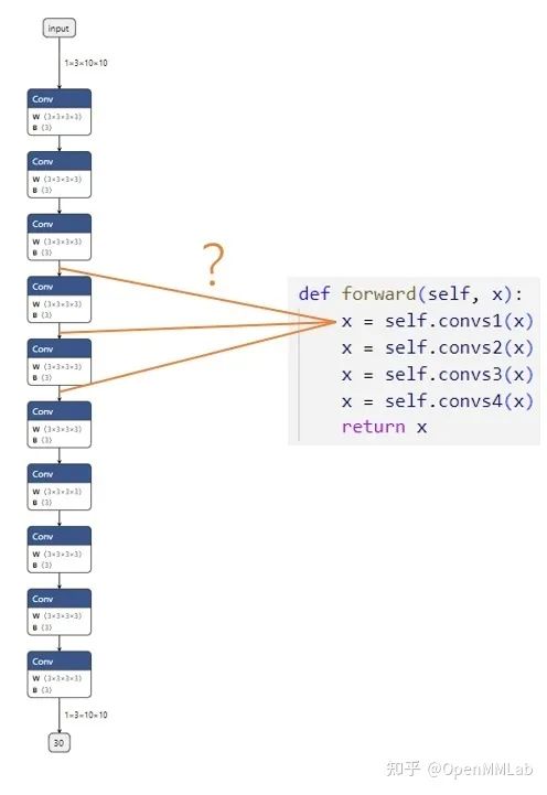 假设我们现在有一个由很多卷积块 convs1, convs2... 组成的网络,我们想对齐 PyTorch 模型和 ONNX 模型的精度。第一步,我们想比较第一个卷积块的输出 x = self.convs1(x)。模块在PyTorch 模型中的输出可以很轻松地得到,可是,这个输出究竟对应 ONNX 模型里的哪一个输出呢?在小模型里,我们或许能够通过阅读 PyTorch 模型的源码,推断出每个 ONNX 模块与 PyTorch 模块的对应关系;但是,在大模型中,我们是难以建立 PyTorch 与 ONNX 的对应关系的。