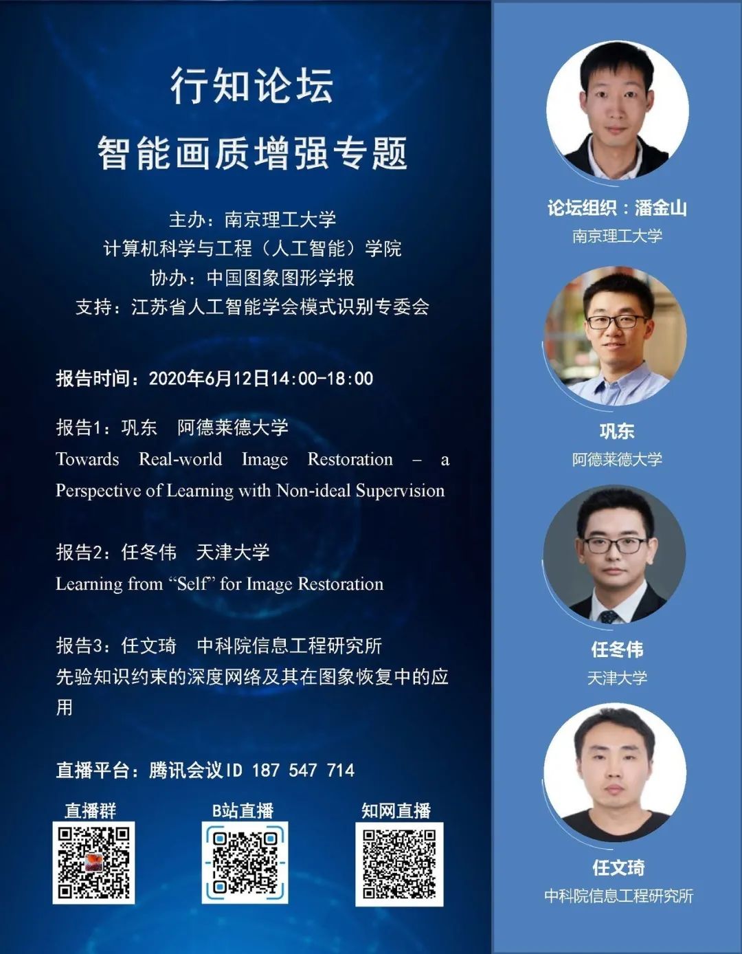 本期论坛的主题是智能画质增强,由南京理工大学计算机科学与工程学院潘金山教授组织,邀请了图像复原领域三名青年才俊分享最新成果。