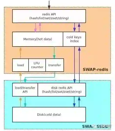 R2M 的冷热交换存储的基本思想是:基于 key 访问次数 (LFU) 的热度统计算法识别出热点数据,并将热点数据保留在 Redis 中,对于无访问 / 访问次数少的数据则转存到 SSD 上,如果 SSD 上的 key 再次变热,则重新将其加载到 Redis 内存中。