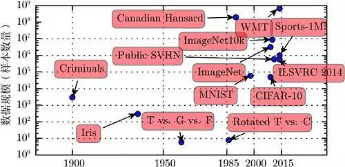 在 21 世纪的第一个 10 年里,相同大小更复杂的数据集持续出现,如 CIFAR-10 数据集 (Krizhevsky and Hinton, 2009)。在这 10 年结束和接下来的 5 年,明显更大的数据集 (包含数万到数千万的样例) 完全改变了深度学习可能实现的事。这些数据集包括公共 Street View House Numbers 数据集 (Netzer et al., 2011)、各种版本的 ImageNet 数据集 (Deng et al., 2009, 2010a; Russakovsky et al., 2014a) 以及 Sports-1M 数据集 (Karpathy et al., 2014)。在图顶部,我们看到翻译句子的数据集通常远大于其他数据集,如根据 Canadian Hansard 制作的 IBM 数据集 (Brown et al., 1990) 和 WMT 2014 英法数据集 (Schwenk, 2014)这种趋势是由社会日益数字化驱动的。由于我们的活动越来越多地发生在计算机上,我们做什么也越来越多地被记录。由于计算机越来越多地联网在一起,这些记录变得更容易集中管理,并更容易将它们整理成适于机器学习应用的数据集。因为统计估计的主要负担 (观察少量数据以在新数据上泛化) 已经减轻,“大数据”时代使机器学习更加容易。截至 2016 年,一个粗略的经验法则是,监督深度学习算法在每类给定约 5000 个标注样本情况下一般将达到可以接受的性能,当至少有 1000 万个标注样本的数据集用于训练时,它将达到或超过人类表现。此外,在更小的数据集上获得成功是一个重要的研究领域,为此我们应特别侧重于如何通过无监督或半监督学习充分利用大量的未标注样本。