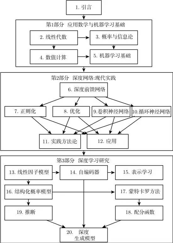 读者可以随意跳过不感兴趣或与自己背景不相关的部分。熟悉线性代数、概率和基本机器学习概念的读者可以跳过第 1 部分。若读者只是想实现一个能工作的系统,则不需要阅读超出第 2 部分的内容。为了帮助读者选择章节,下图给出了本书高层组织结构的流程图。