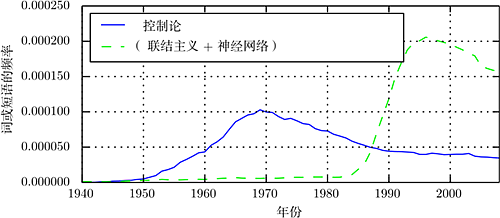 图 1.7 根据 Google 图书中短语“控制论”“联结主义”或“神经网络”频率衡量的人工神经网络研究的历史浪潮 ( 图中展示了 3 次浪潮的前两次,第 3 次最近才出现)。第 1 次浪潮开始于 20 世纪 40 年代到 20 世纪 60 年代的控制论,随着生物学习理论的发展 (McCulloch and Pitts, 1943; Hebb, 1949) 和第一个模型的实现 (如感知机 (Rosenblatt, 1958)),能实现单个神经元的训练。第 2 次浪潮开始于 1980—1995 年间的联结主义方法,可以使用反向传播 (Rumelhart et al., 1986a) 训练具有一两个隐藏层的神经网络。当前第 3 次浪潮,也就是深度学习,大约始于 2006 年 (Hinton et al., 2006a; Bengio et al., 2007a; Ranzato et al., 2007a),并且于 2016 年以图书的形式出现。另外,前两次浪潮类似地出现在书中的时间比相应的科学活动晚得多。