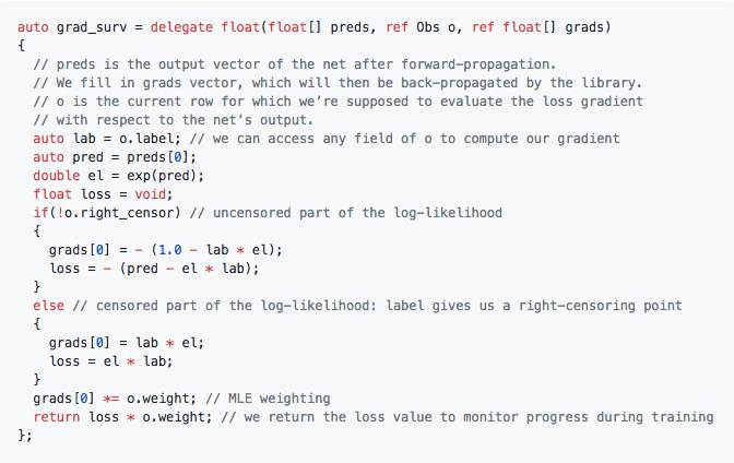 举例来说,我们立足 Netflix 在营销工作当中遭遇的一项宣传问题对该库的性能水平进行调查。在此案例中,我们需要配合一条生存指数分布对最大似然估算进行加权计算。要实现这贡目标,我们向 Vectorflow 传递出以下定制化回调函数: