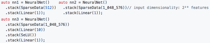 模型 3:稀疏特征组上的浅层神经网络(需要学习 1000 万项参数),训练数据量翻倍