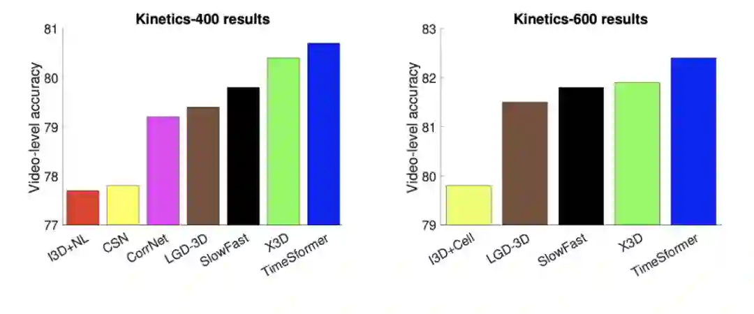 在 Kinetics-400(左) 和 Kinetics-600(右) 两个动作识别基准上,TimeSformer 与当前具有 SOTA 性能的 3D 卷积神经网络的视频分类准确率比较结果。TimeSformer 在这两个数据集上都达到了最优的准确率。